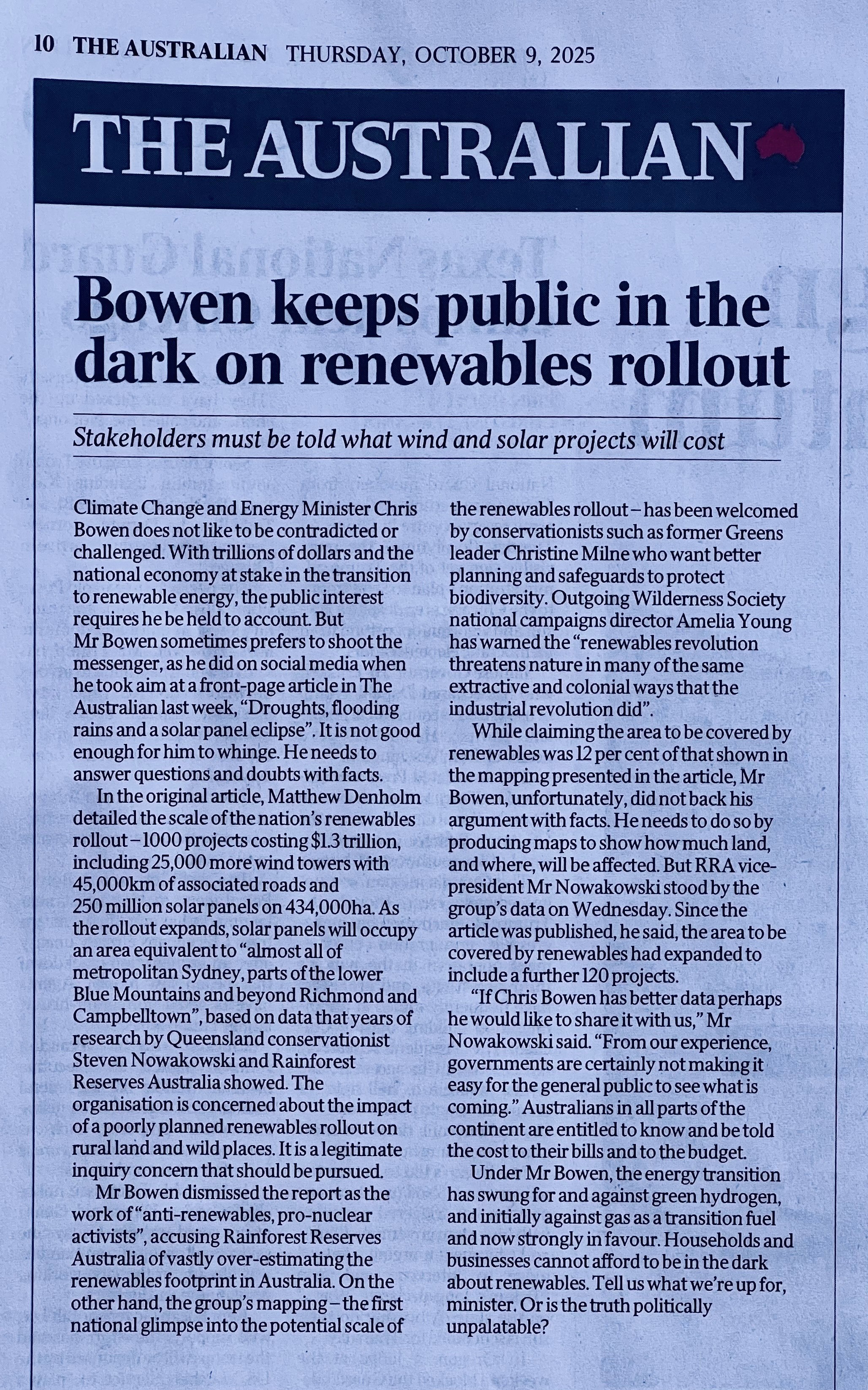 ‘The massive rollout of renewables – to meet renewable-energy and emissions-reduction targets-is creating tensions across regional and rural Australia, with landowners facing massive fines in Victoria for locking out developers, as communities seek to defend landscapes and treasured bird and other species.’