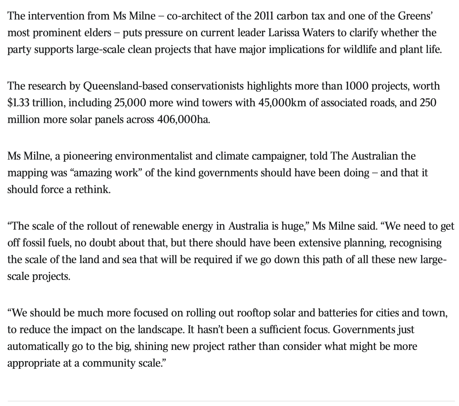 'The former Greens leader, who has urged environmental groups to fight renewables projects that damage biodiversity, hailed landmark mapping of the renewables rollout revealed in The Australian.' 'Ms Milne, a pioneering environmentalist and climate campaigner, told The Australian the mapping was “amazing work” of the kind governments should have been doing – and that it should force a rethink.' 'Ms Milne called for communities, not energy developers, to decide where renewable projects were located. “We’ve gone completely the other way: what we have now is a developer-led mess,” she said.’