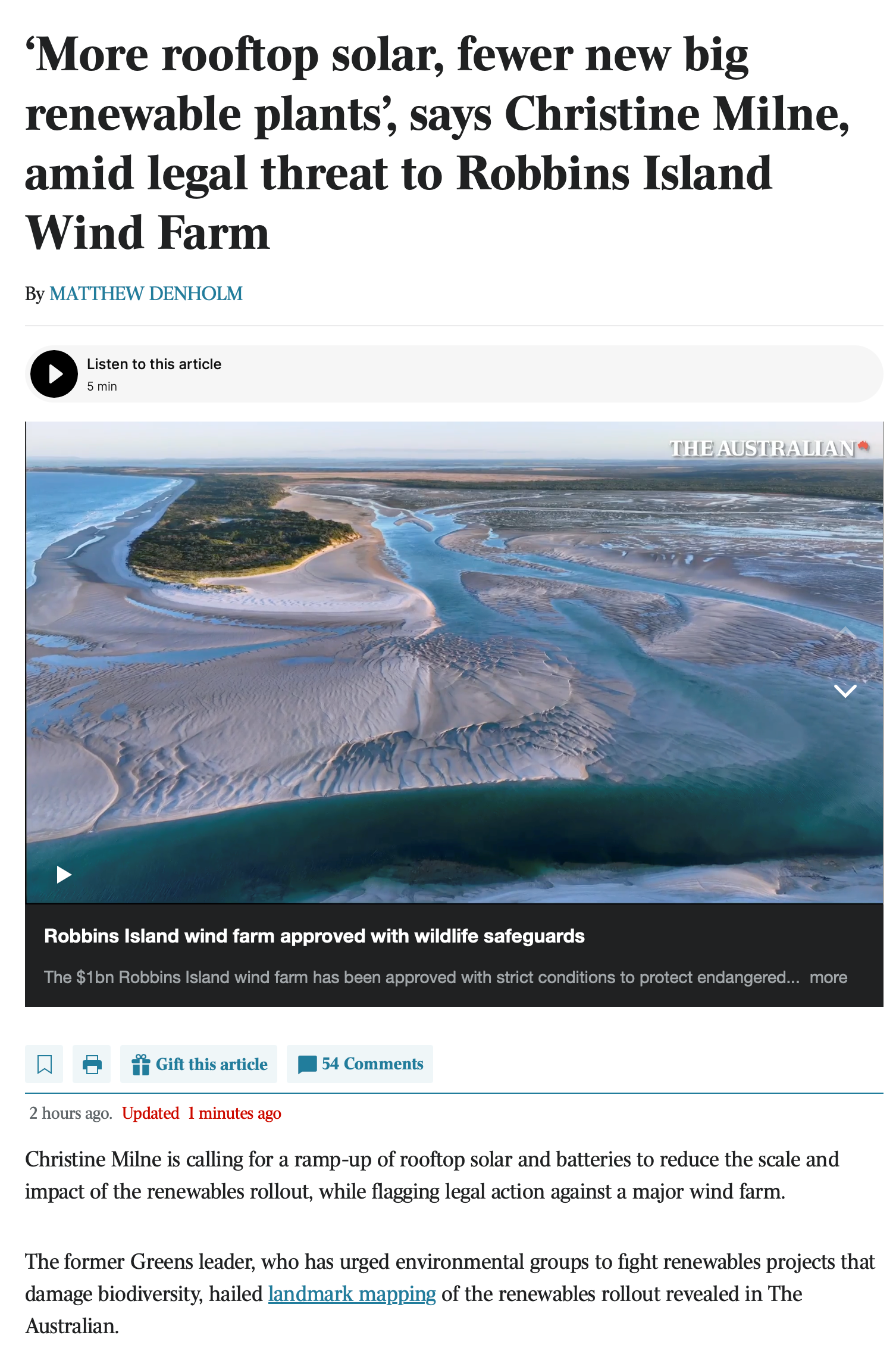 'The former Greens leader, who has urged environmental groups to fight renewables projects that damage biodiversity, hailed landmark mapping of the renewables rollout revealed in The Australian.' 'Ms Milne, a pioneering environmentalist and climate campaigner, told The Australian the mapping was “amazing work” of the kind governments should have been doing – and that it should force a rethink.' 'Ms Milne called for communities, not energy developers, to decide where renewable projects were located. “We’ve gone completely the other way: what we have now is a developer-led mess,” she said.’
